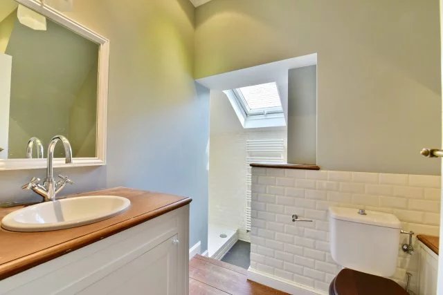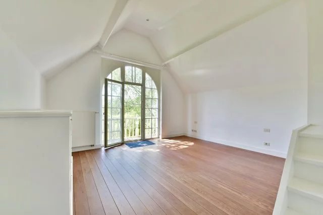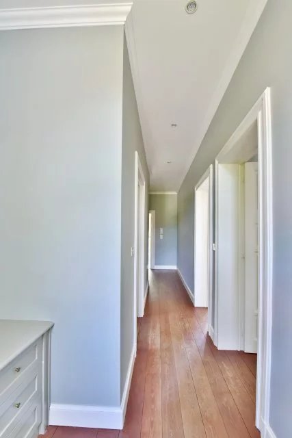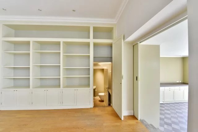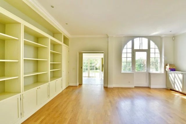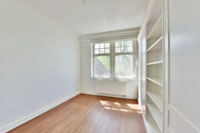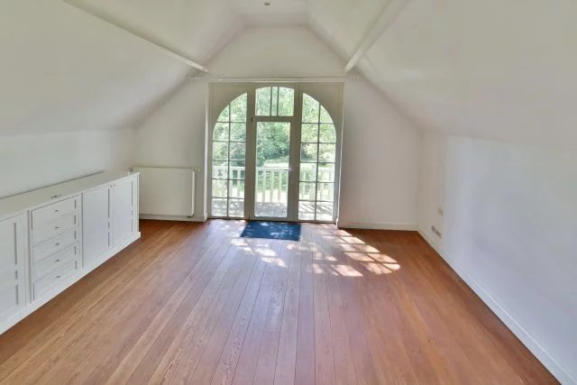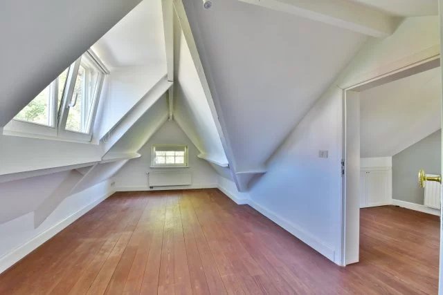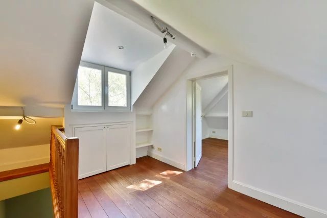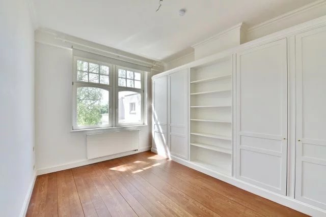 Wooden window frames, solid wood flooring, numerous built-in cupboards.